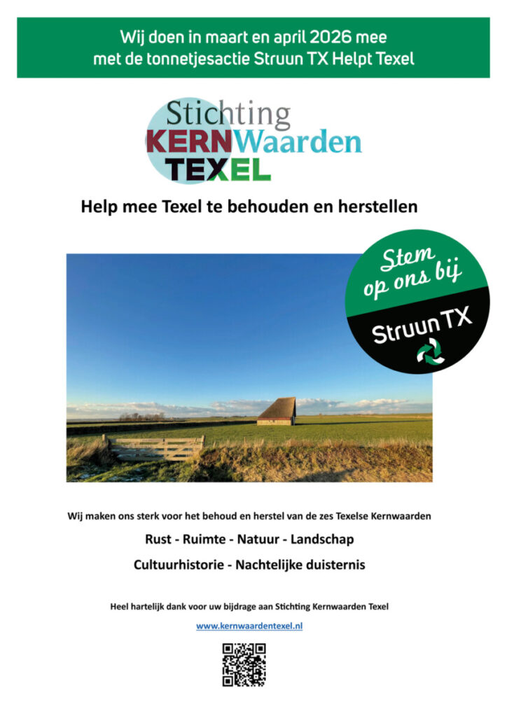 Is ons werk voor het behoud van een mooi eiland u ook wat waard? Overweeg dan eens een donatie. Dat helpt ons enorm; bij voorbaat onze grote dank! (IBAN: NL80TRIO0197976859 t.n.v. Stichting Kernwaarden Texel; SKT is erkend als ANBI).