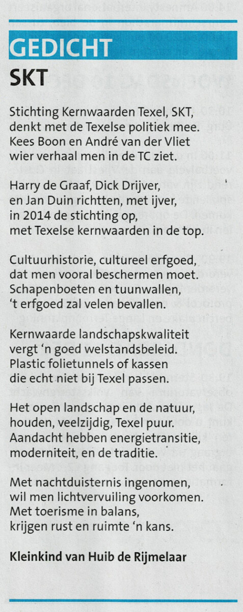 - Uitgebreid interview met voorzitter Cees Boon en André van der Vliet in de Texelse Courant van 25 november. Dit paginagrote artikel inspireerde ‘Kleinkind van Huid de Rijmelaar’ tot een mooi gedicht in de TC van 5 december!